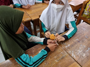 Sebelum pelaksanaan program penulis sudah menyiapkan kain berbentuklingkaran dan sudah dipasang tali, agar mempermudah saat pelaksanaan. Dimulai dari pembagian kain yang bertali, isian boneka menggunakan dakron, hingga pemberian kain pita dan penempelan mata palsu. Diharapkan dari program ini adalah melatih kreatifitas siswa karena mereka dapat melukis wajah diboneka tersebut, hingga melatih kerja sama antar kelompok.